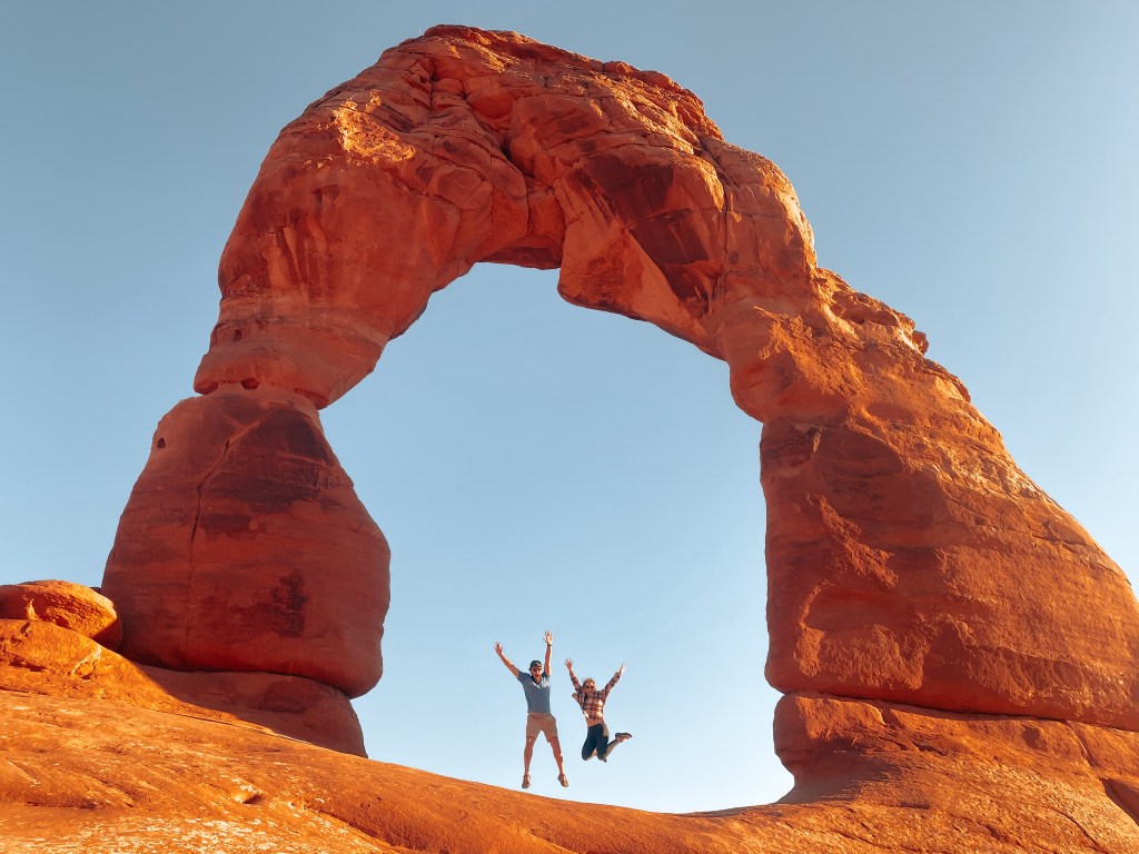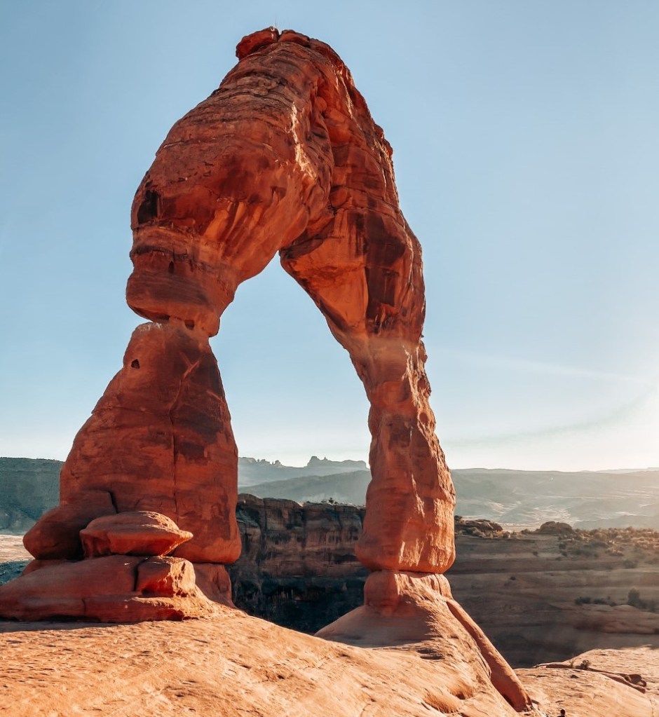 Delicate Arch was the highlight of the trip. The 3-mile out-and-back trail leads you to the arch proudly displayed on Utah license plates and the Welcome to Utah highway sign. The best tip of the trip was to visit the arch at sunset and despite hundreds of people with the same idea we still had plenty of space to enjoy the views. This hike was moderate with steep drop-offs and some rock scrambles, but families of all ages were hiking alongside us! Start your hike two hours before sunset because it’ll take you an hour to reach the arch. Golden hour at the arch makes the red rocks light up and the canyon silhouette is captivating. Towards the end of the trail along the cliff side you’ll see a small hole in the canyon wall. The steep climb to this cutout is risky, but it’s the perfect spot to watch the arch and canyons settle into dusk away from the crowds. We hiked back to the trailhead before dark and went to sleep early in prep for a sunrise hike in the morning.