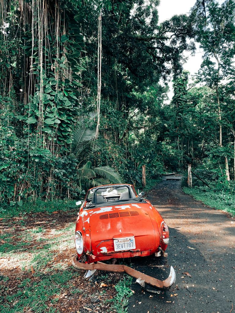 Nahiku (mile marker 25.5) The small plantation town has fruit stands and a dangerous one lane road. This is where I almost drove us off a cliff, but the views at the bottom of the road are worth the risky drive. We parked right before the old bridge next to a broken down red convertible and walked to the end of the road. You’ll pass the Nahiku swimming pond and a trail to the left of the ocean leads down to a secluded waterfall colliding with the sea. A private area to take a dip!